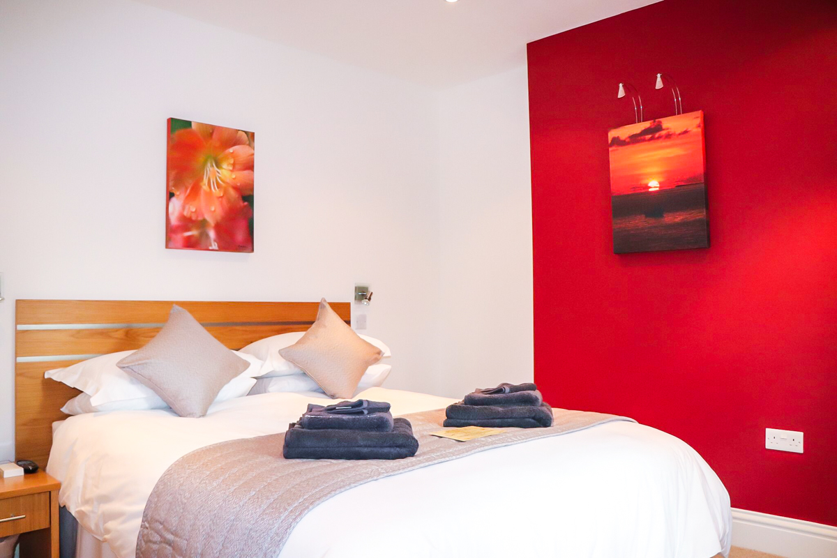 Each of our downstairs bedrooms are fitted with king size beds made with fresh, high-thread count bed linen, fluffy pillows and, for the final touch, elegant bed runners and curtains. These bedrooms are furnished to a high standard and fitted with under-floor heating, Italian-style marble tile flooring and include all the mod-cons of bed-side tables with lights above, TVs serviced with full Freeview package, hairdryers, sockets by the bed and dressing tables, and good size storage.